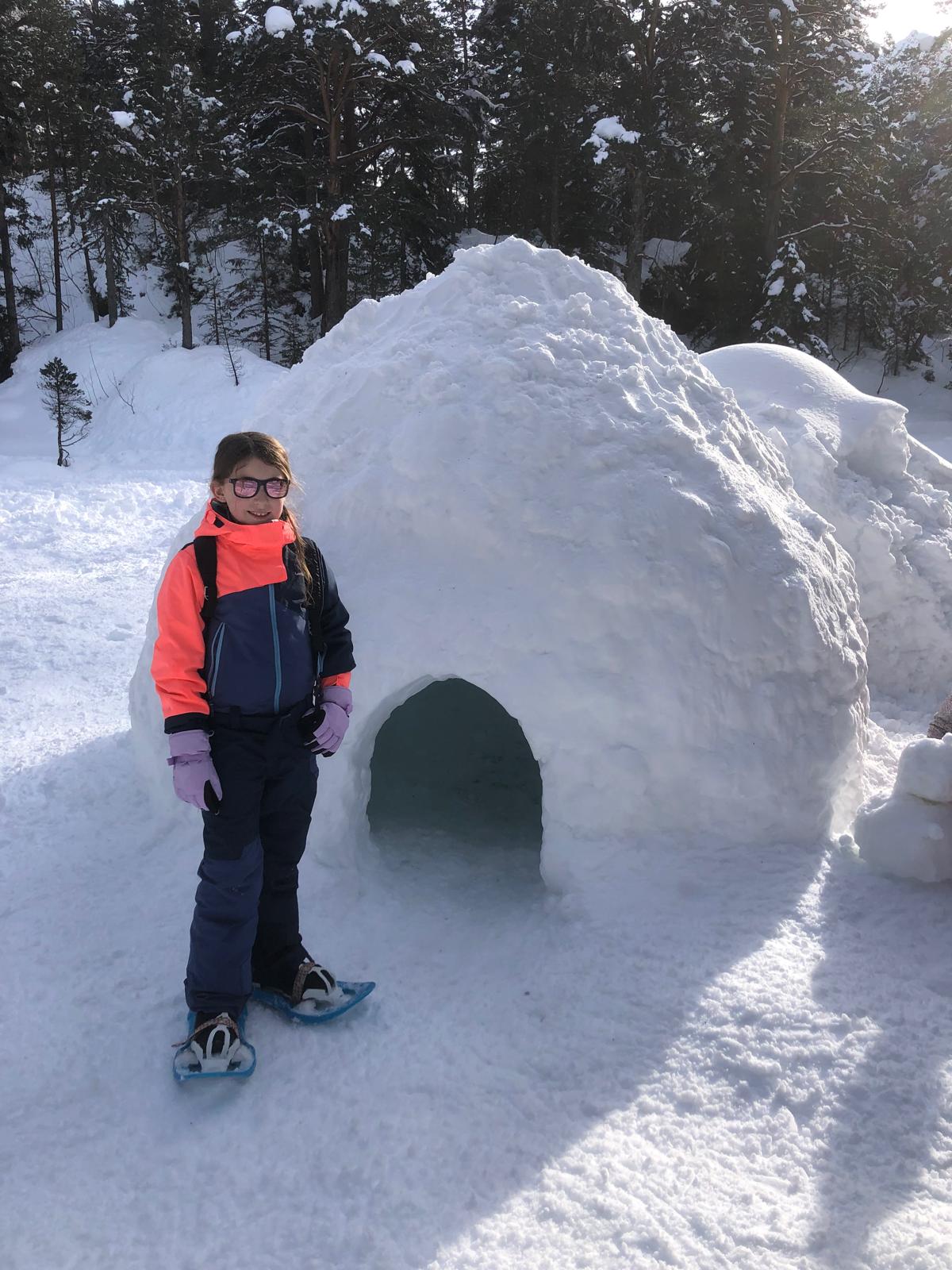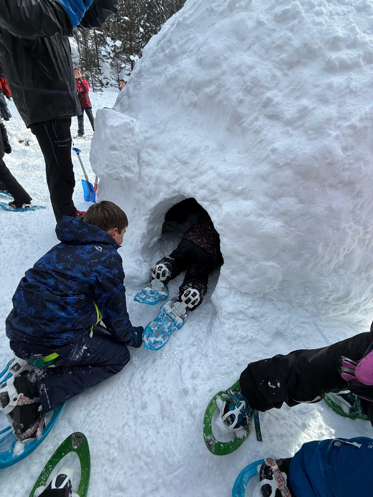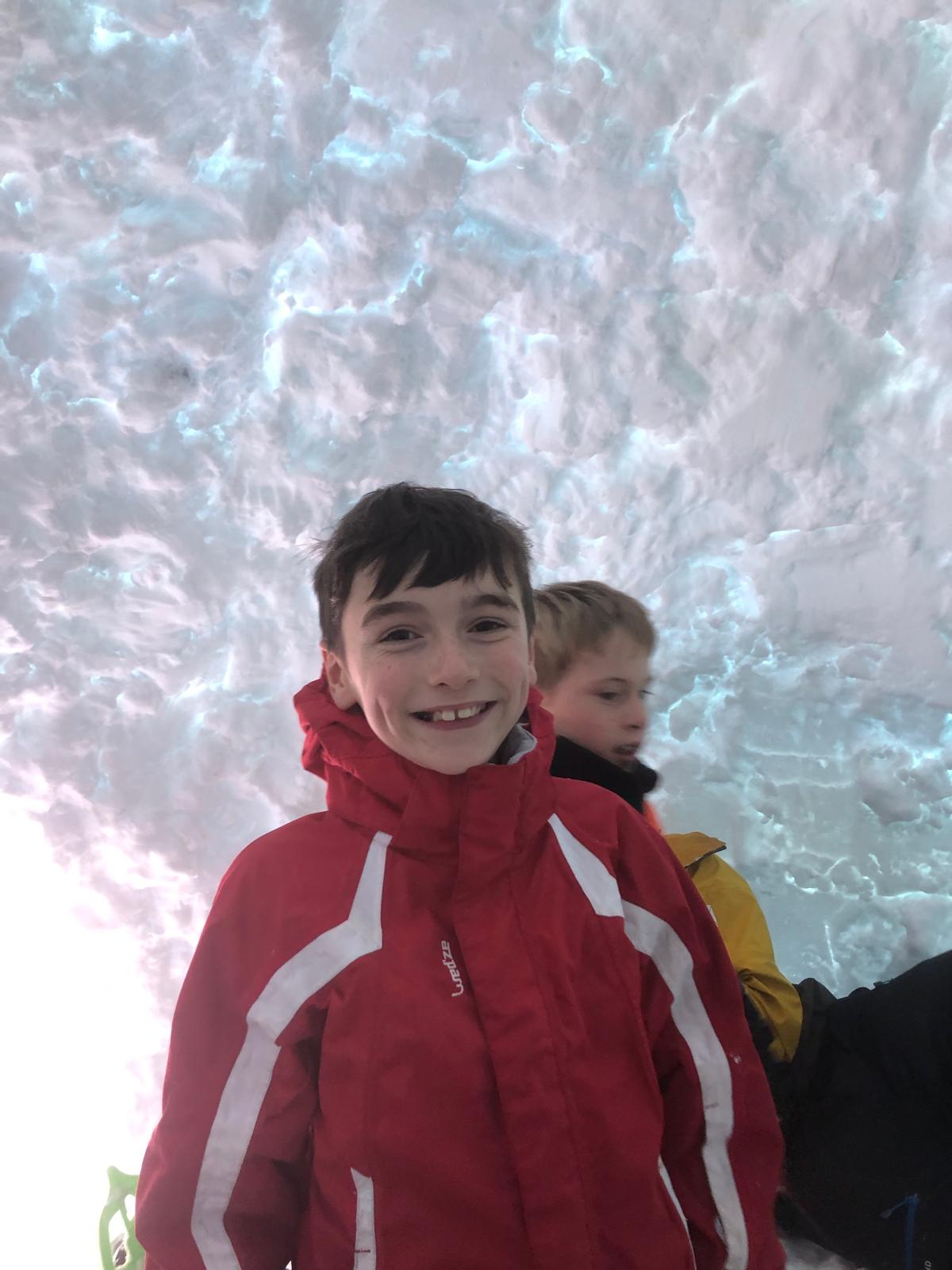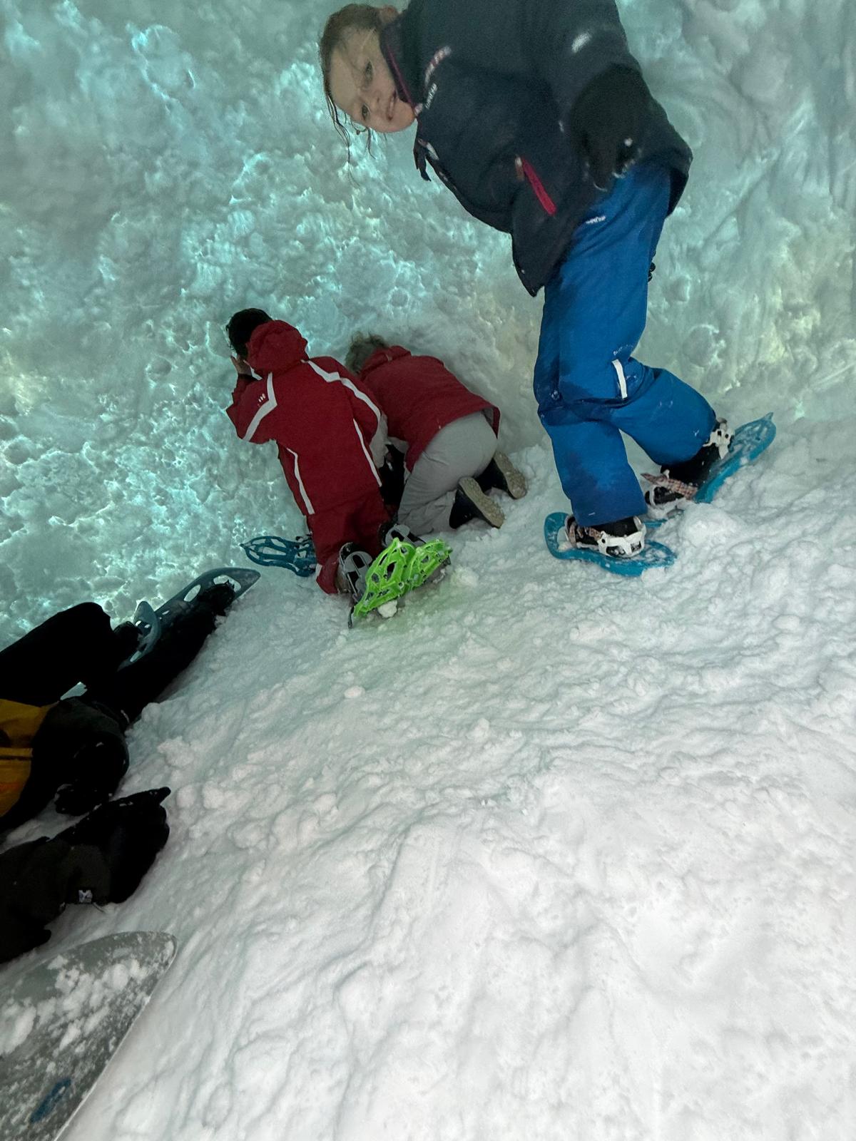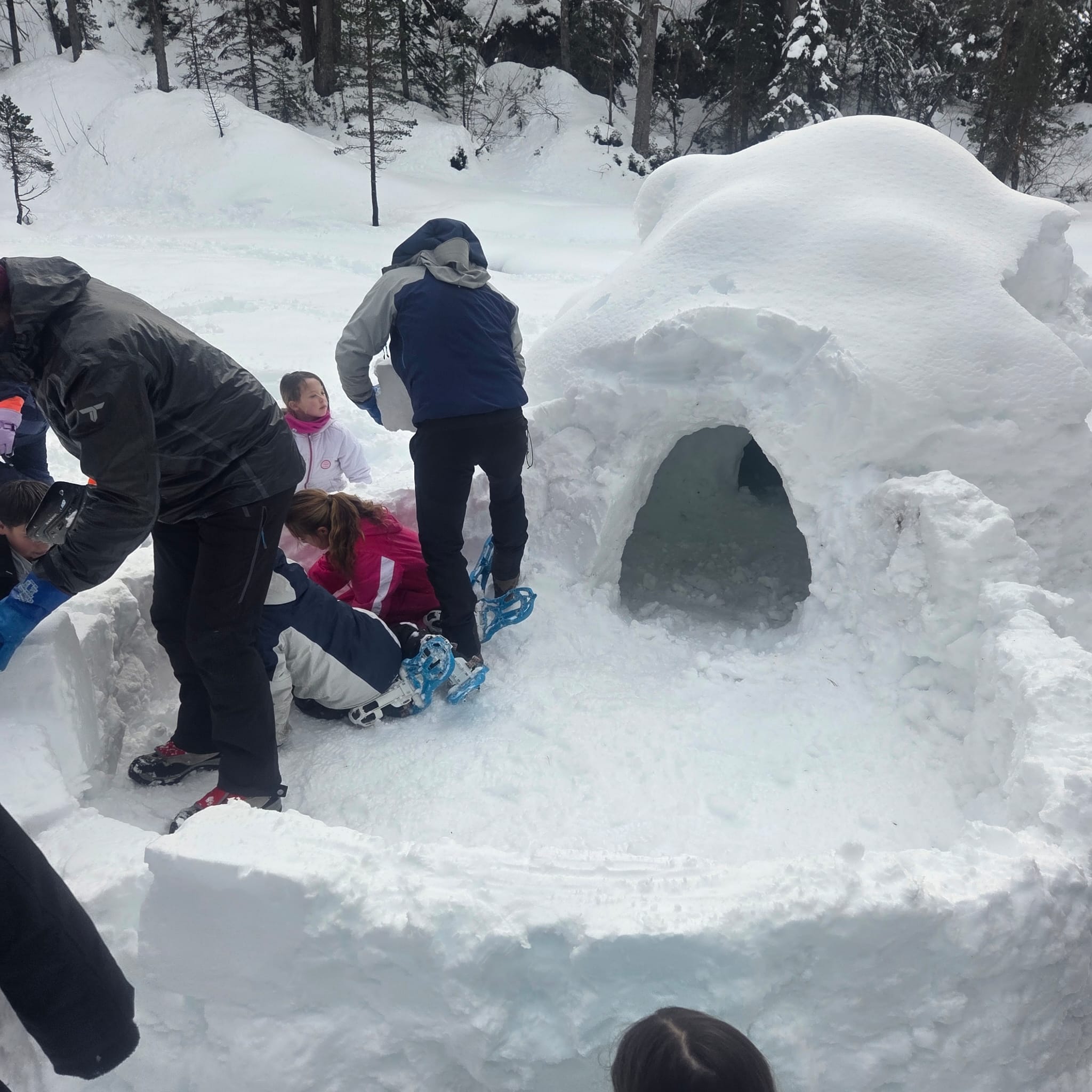 Puis on s’est rassemblés pour faire un igloo géant ! On a fait des briques de neige, des enfants les apportaient aux encadrants qui construisaient les murs et d’autres maçonnaient l’igloo. Quel travail ! Une fois l’igloo construit, on est presque tous allés dedans en même temps, c’était magique ! Il était temps de rentrer, la descente était plus facile que la montée, surtout avec les toboggans de neige mais on s’est plusieurs fois enfoncés dans la poudreuse.