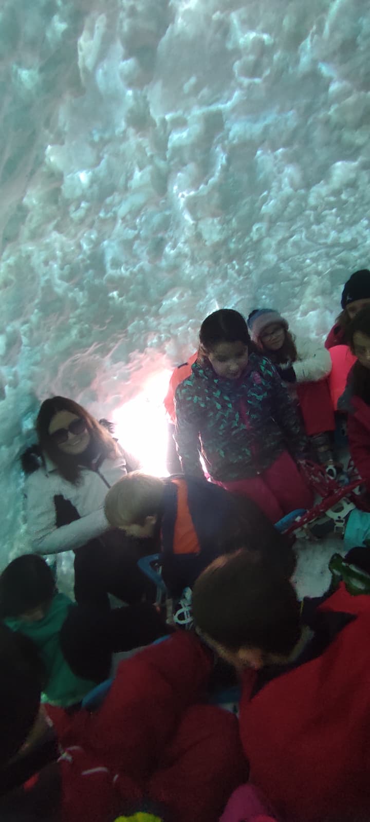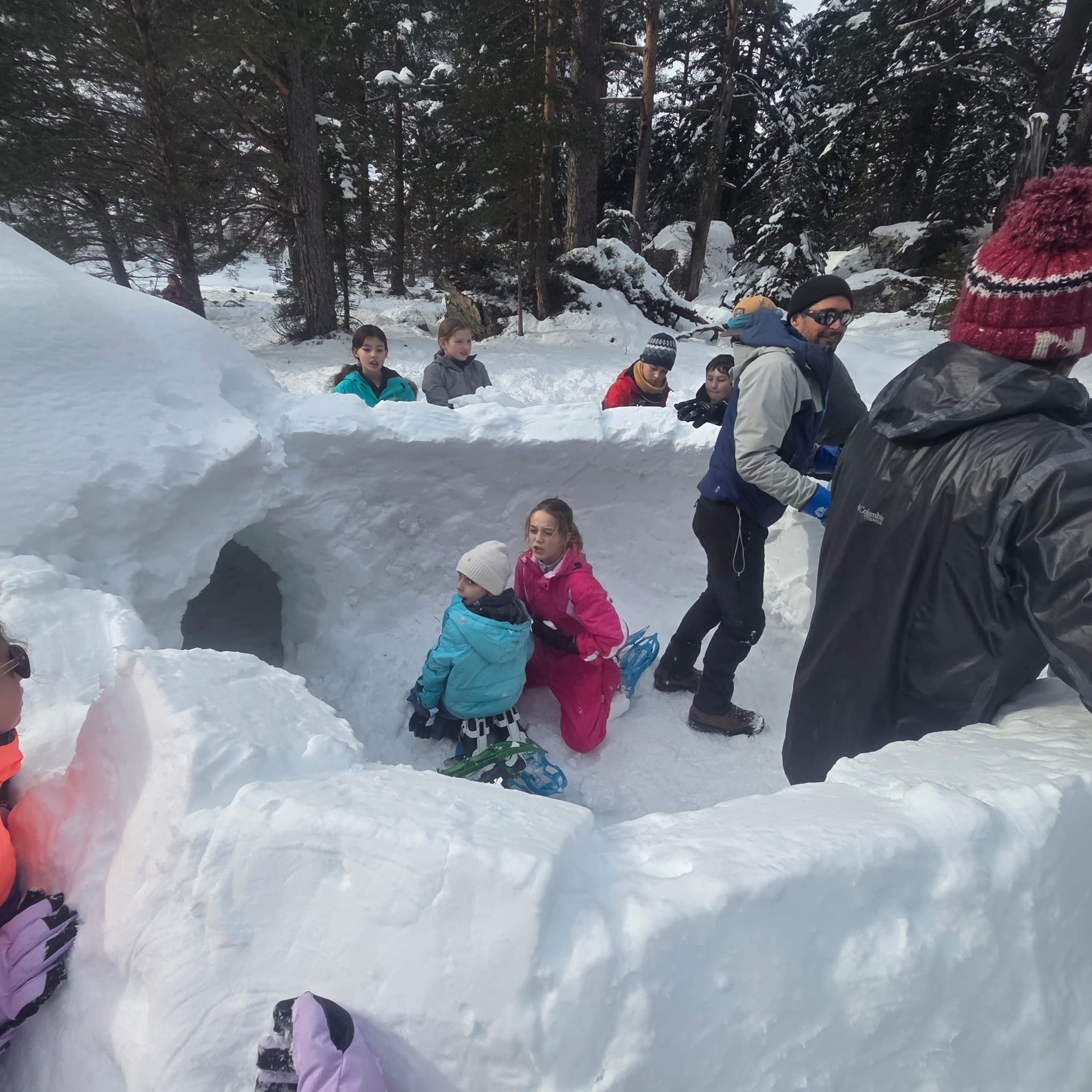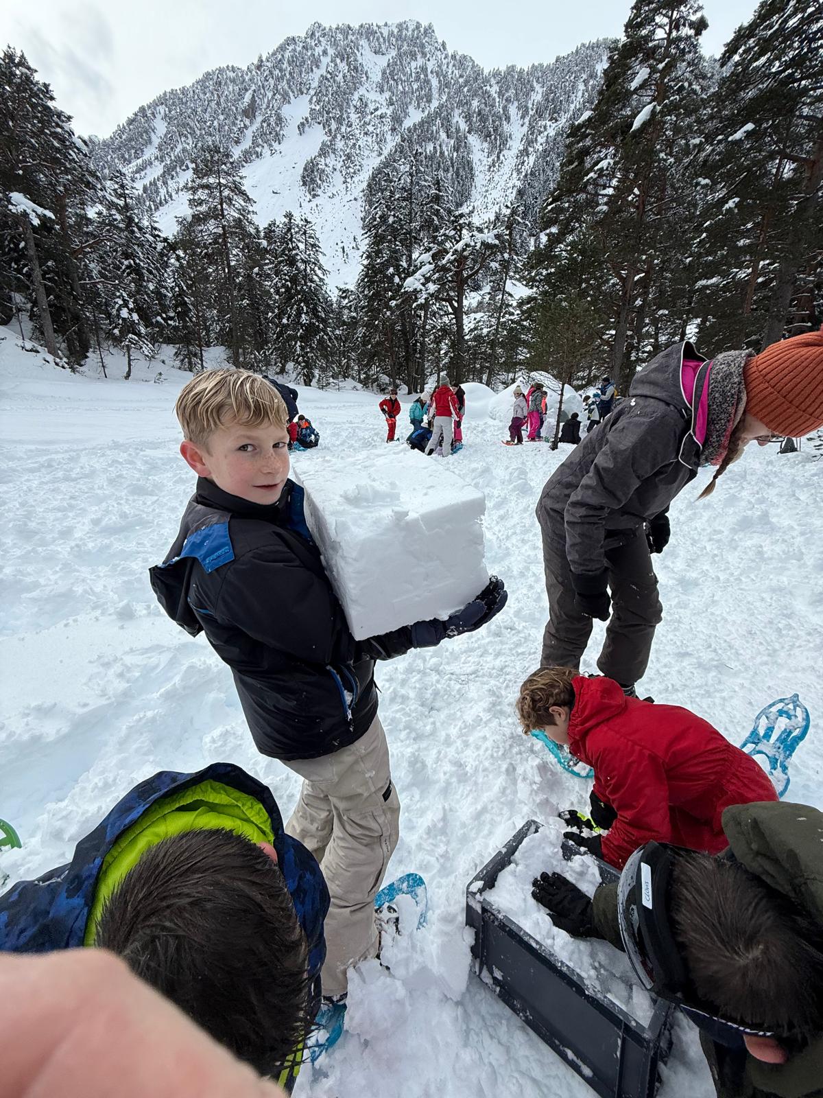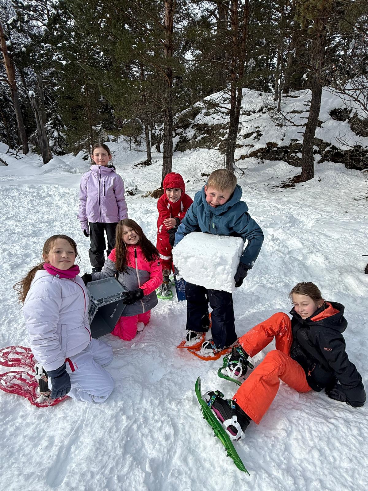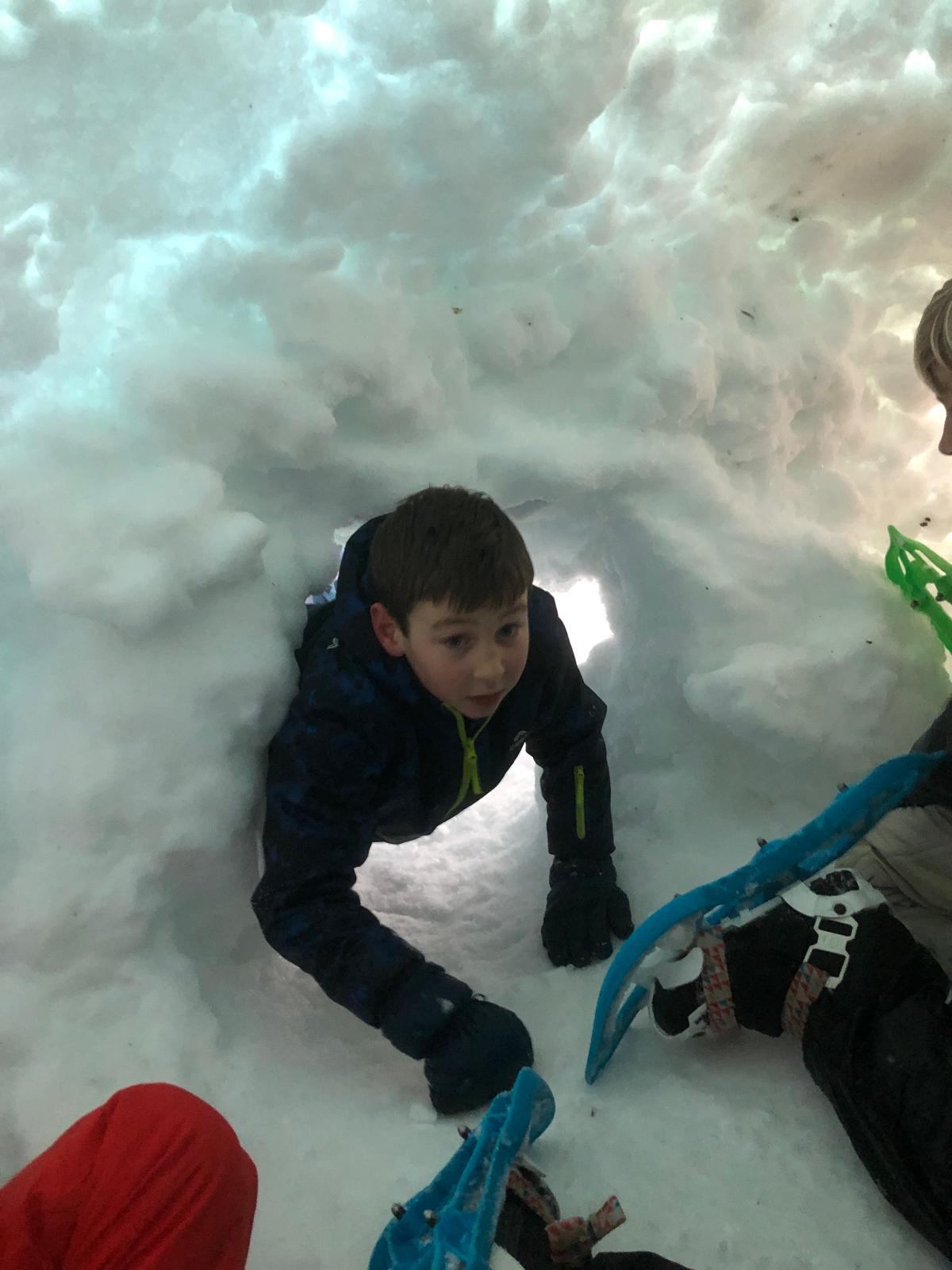 Puis on s’est rassemblés pour faire un igloo géant ! On a fait des briques de neige, des enfants les apportaient aux encadrants qui construisaient les murs et d’autres maçonnaient l’igloo. Quel travail ! Une fois l’igloo construit, on est presque tous allés dedans en même temps, c’était magique ! Il était temps de rentrer, la descente était plus facile que la montée, surtout avec les toboggans de neige mais on s’est plusieurs fois enfoncés dans la poudreuse.