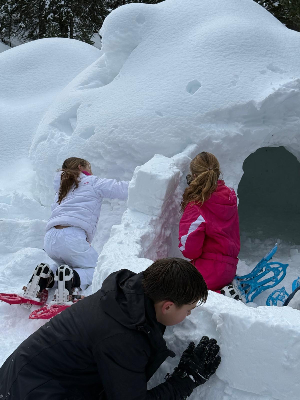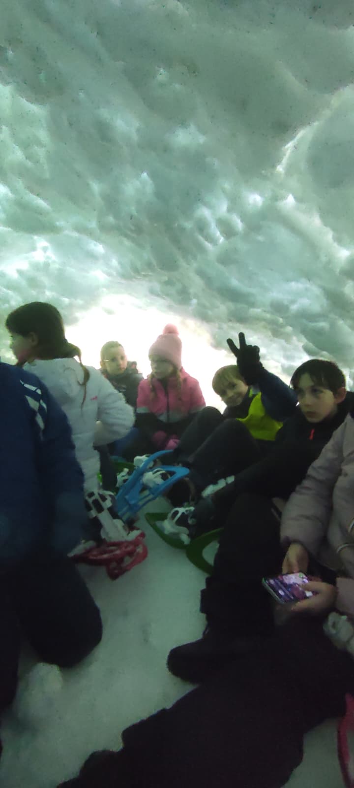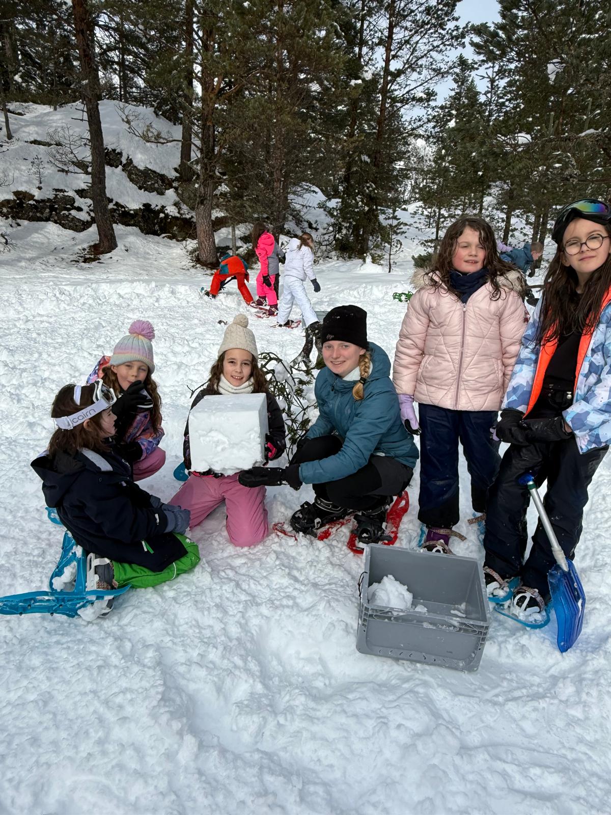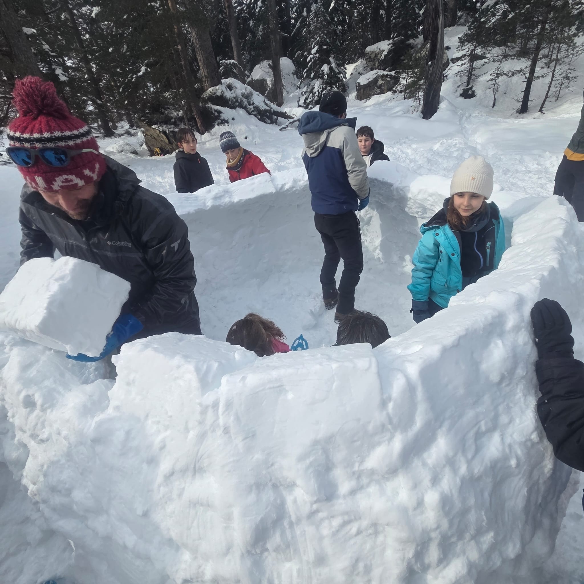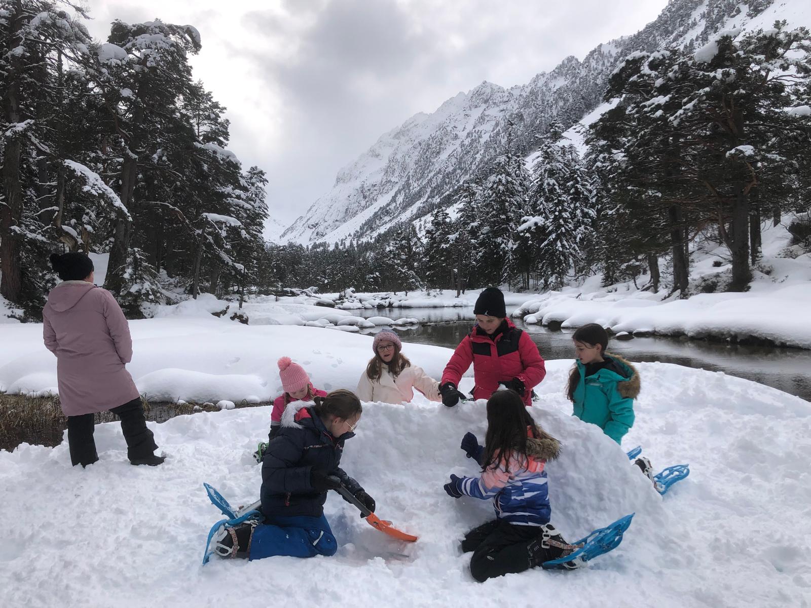 Puis on s’est rassemblés pour faire un igloo géant ! On a fait des briques de neige, des enfants les apportaient aux encadrants qui construisaient les murs et d’autres maçonnaient l’igloo. Quel travail ! Une fois l’igloo construit, on est presque tous allés dedans en même temps, c’était magique ! Il était temps de rentrer, la descente était plus facile que la montée, surtout avec les toboggans de neige mais on s’est plusieurs fois enfoncés dans la poudreuse.