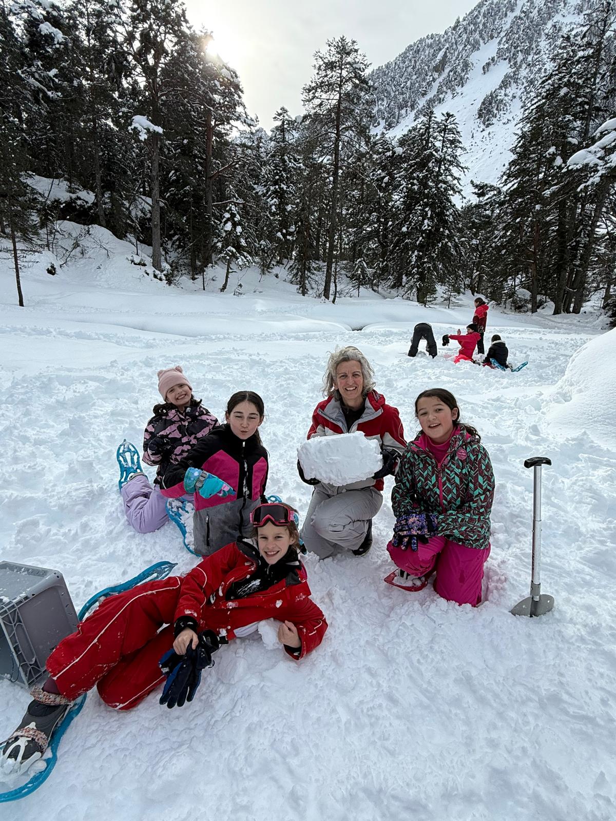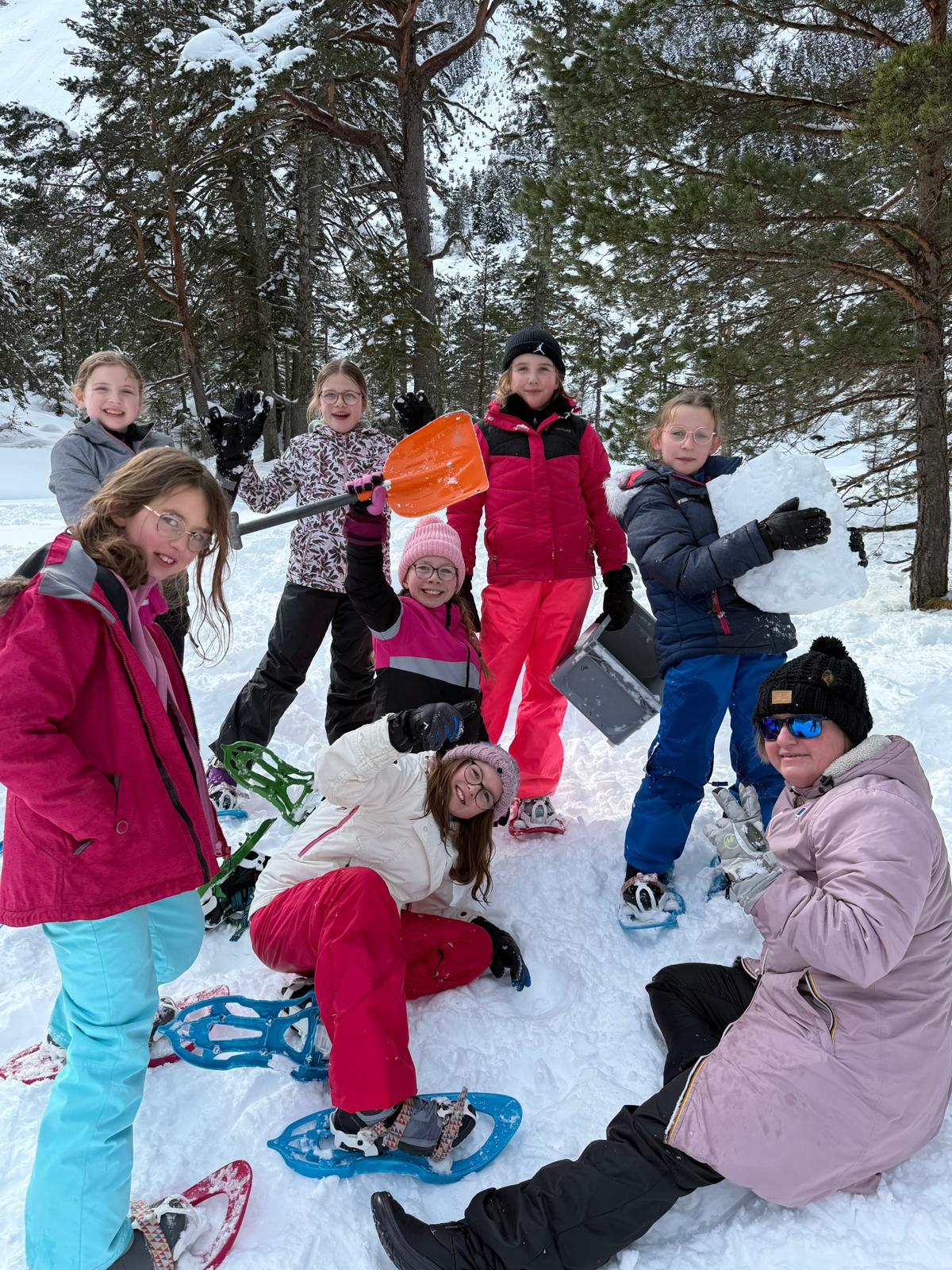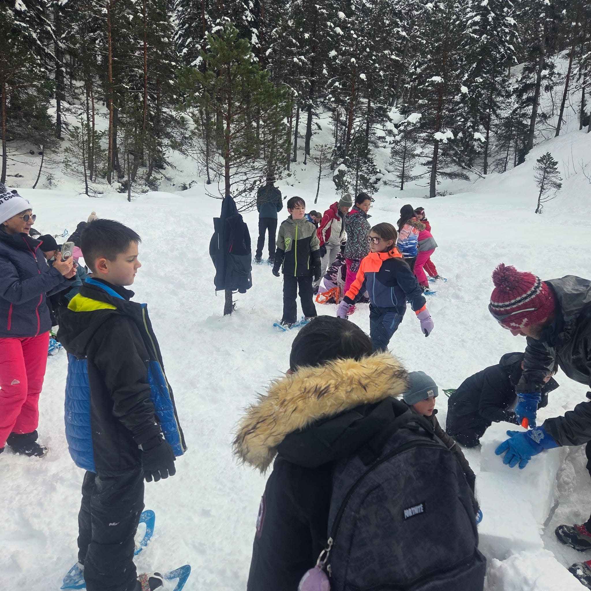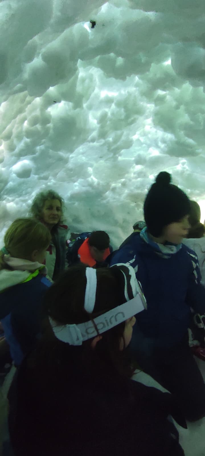 Puis on s’est rassemblés pour faire un igloo géant ! On a fait des briques de neige, des enfants les apportaient aux encadrants qui construisaient les murs et d’autres maçonnaient l’igloo. Quel travail ! Une fois l’igloo construit, on est presque tous allés dedans en même temps, c’était magique ! Il était temps de rentrer, la descente était plus facile que la montée, surtout avec les toboggans de neige mais on s’est plusieurs fois enfoncés dans la poudreuse.