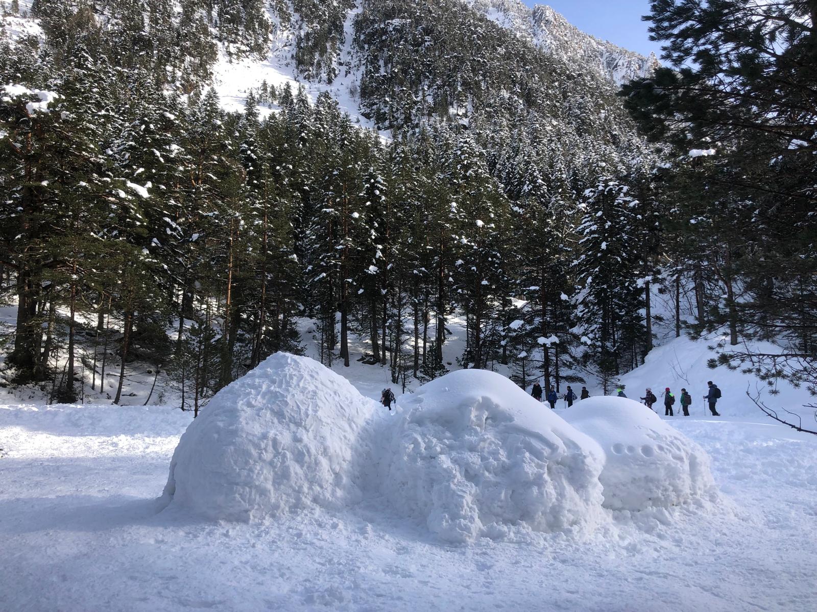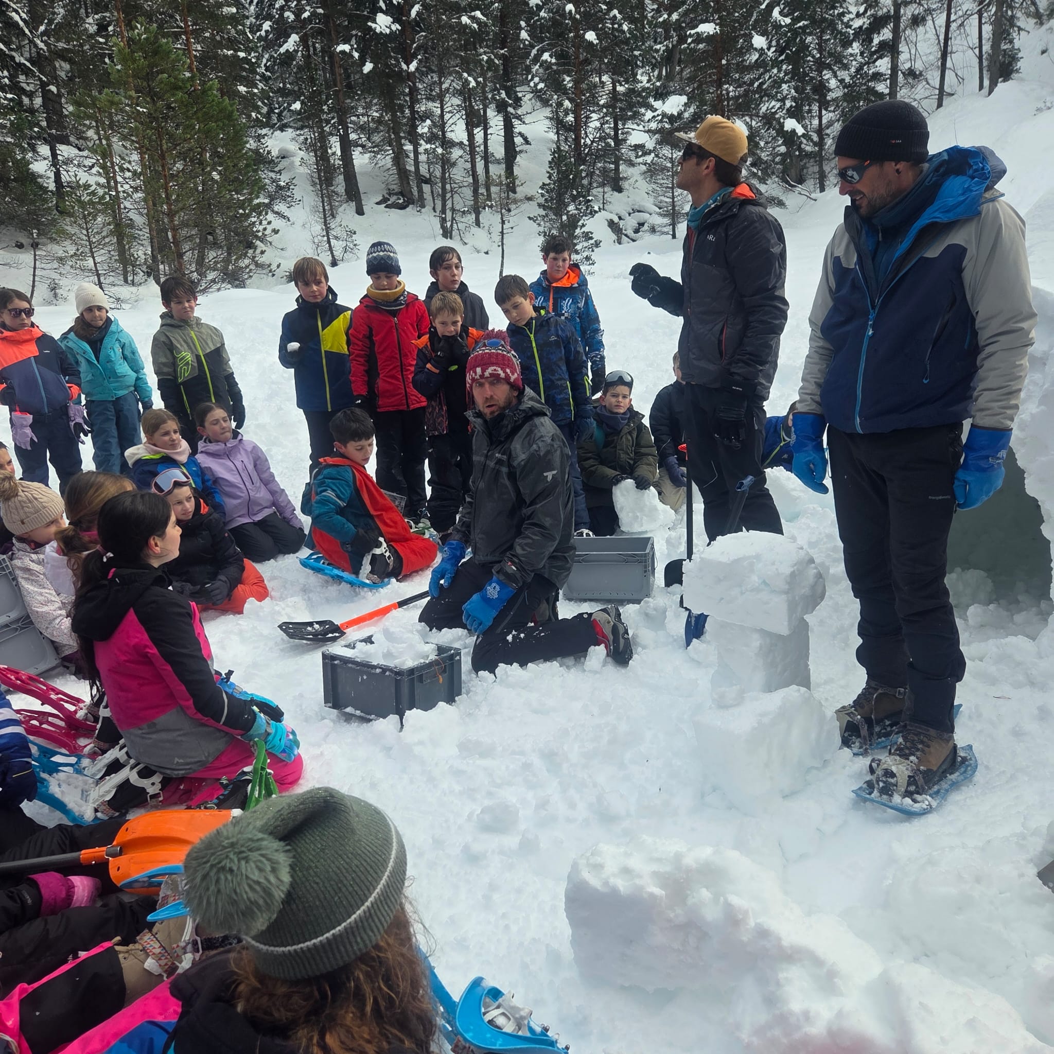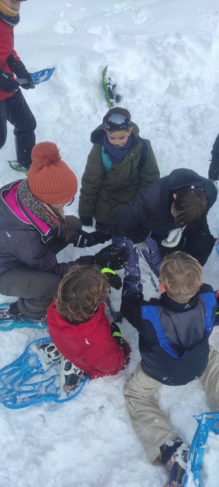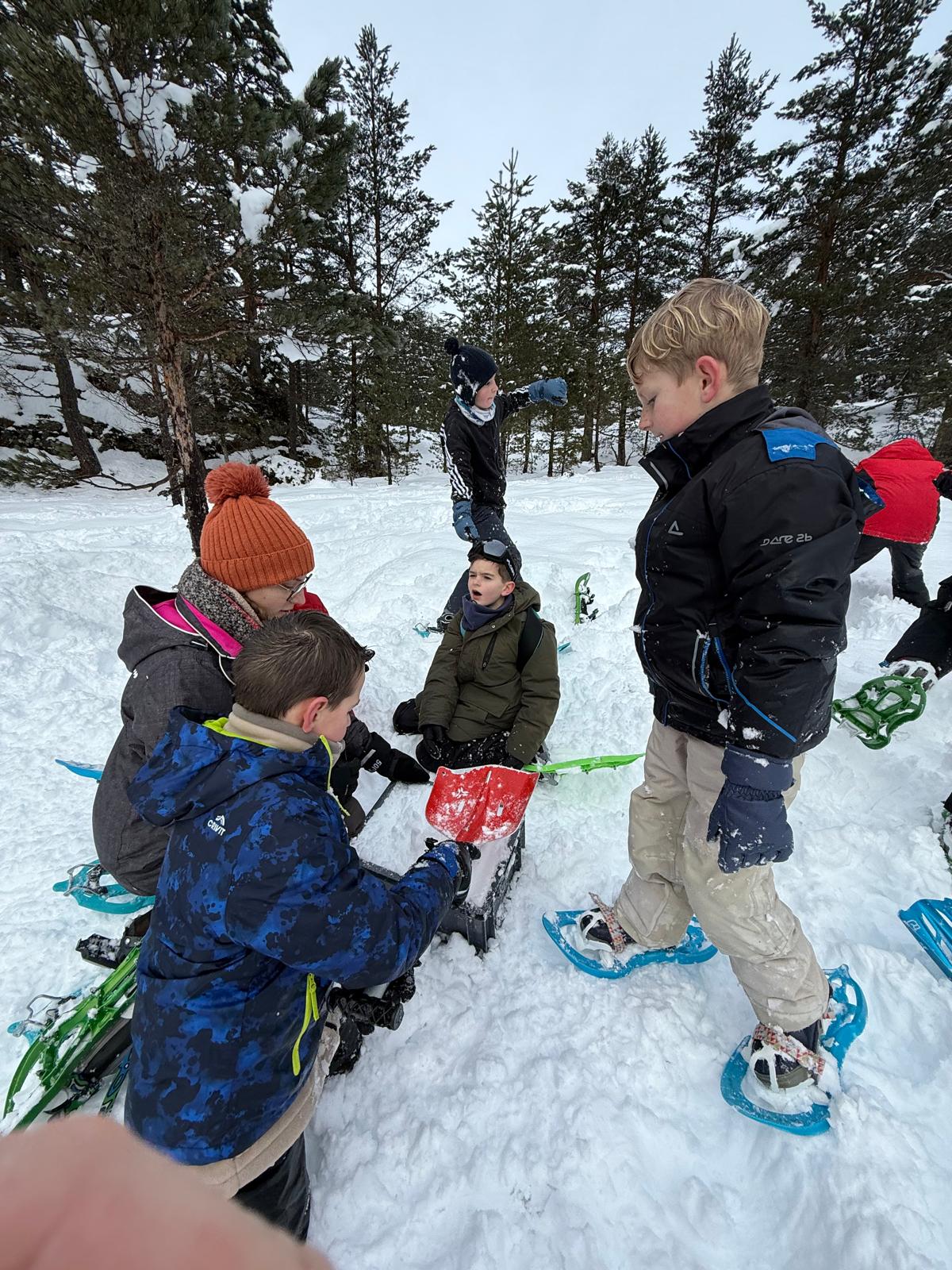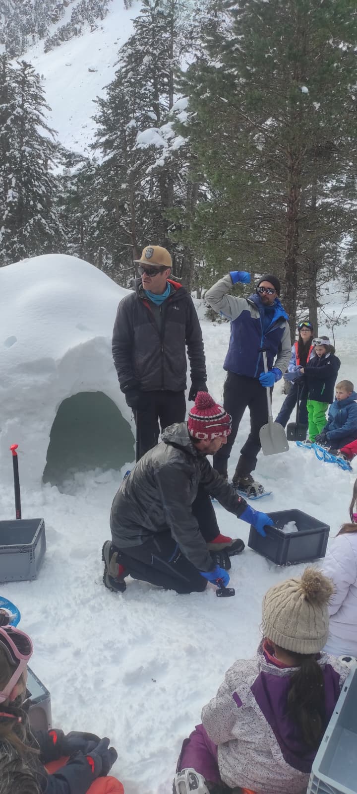 Puis on s’est rassemblés pour faire un igloo géant ! On a fait des briques de neige, des enfants les apportaient aux encadrants qui construisaient les murs et d’autres maçonnaient l’igloo. Quel travail ! Une fois l’igloo construit, on est presque tous allés dedans en même temps, c’était magique ! Il était temps de rentrer, la descente était plus facile que la montée, surtout avec les toboggans de neige mais on s’est plusieurs fois enfoncés dans la poudreuse.