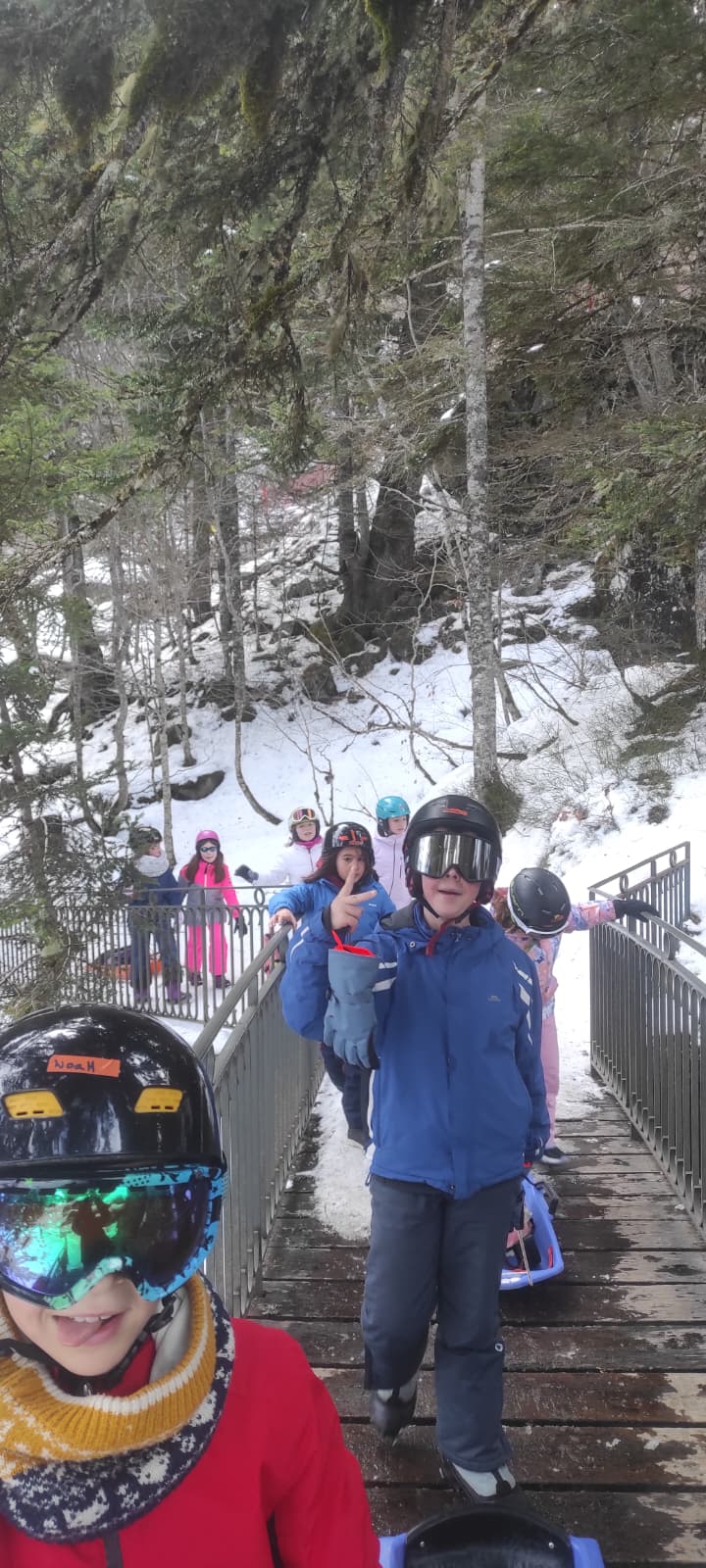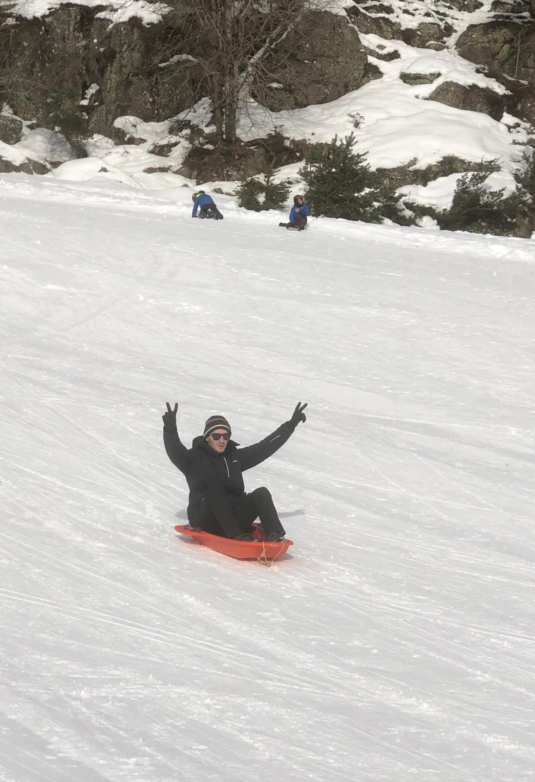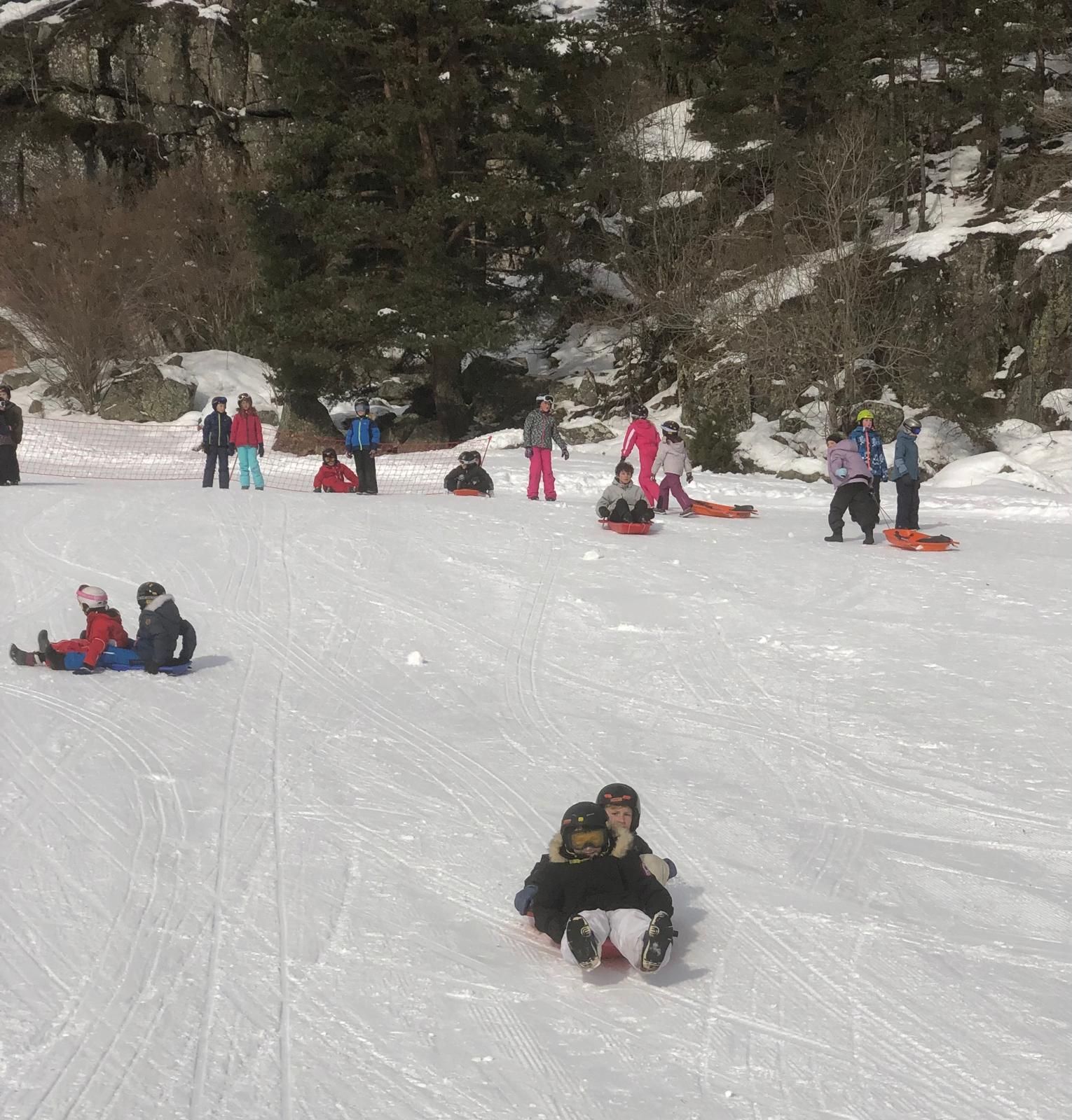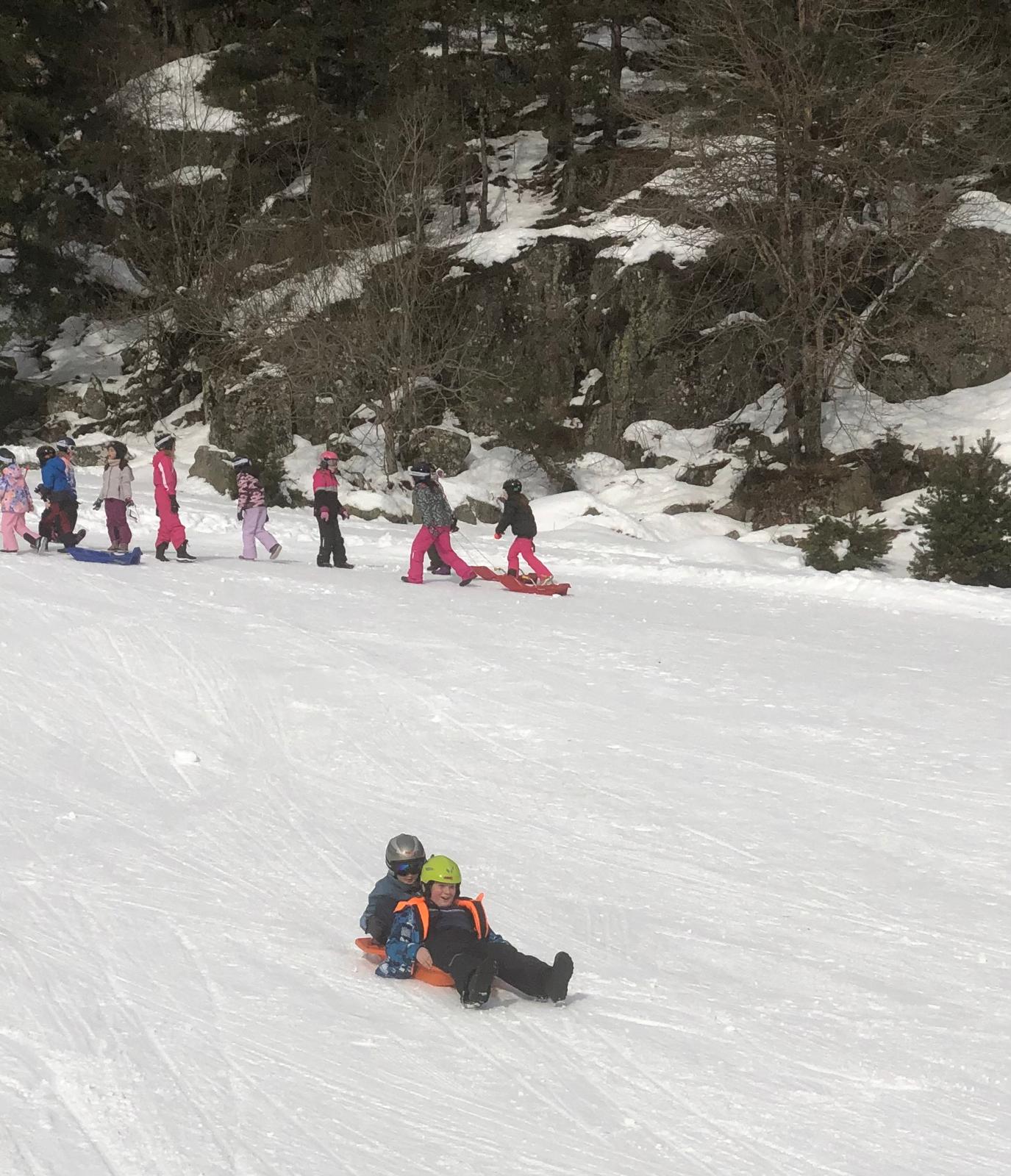 Le car est arrivé et nous avons récupéré des luges au magasin. Quand on est arrivés, il y avait plein de neige !!! Nous avons marché un peu pour arriver sur une immense descente de luge ! Tout le monde s’est précipité sur les luges, parfois, on était même 2 ou 3 par luge ! C’était GENIAL !!!