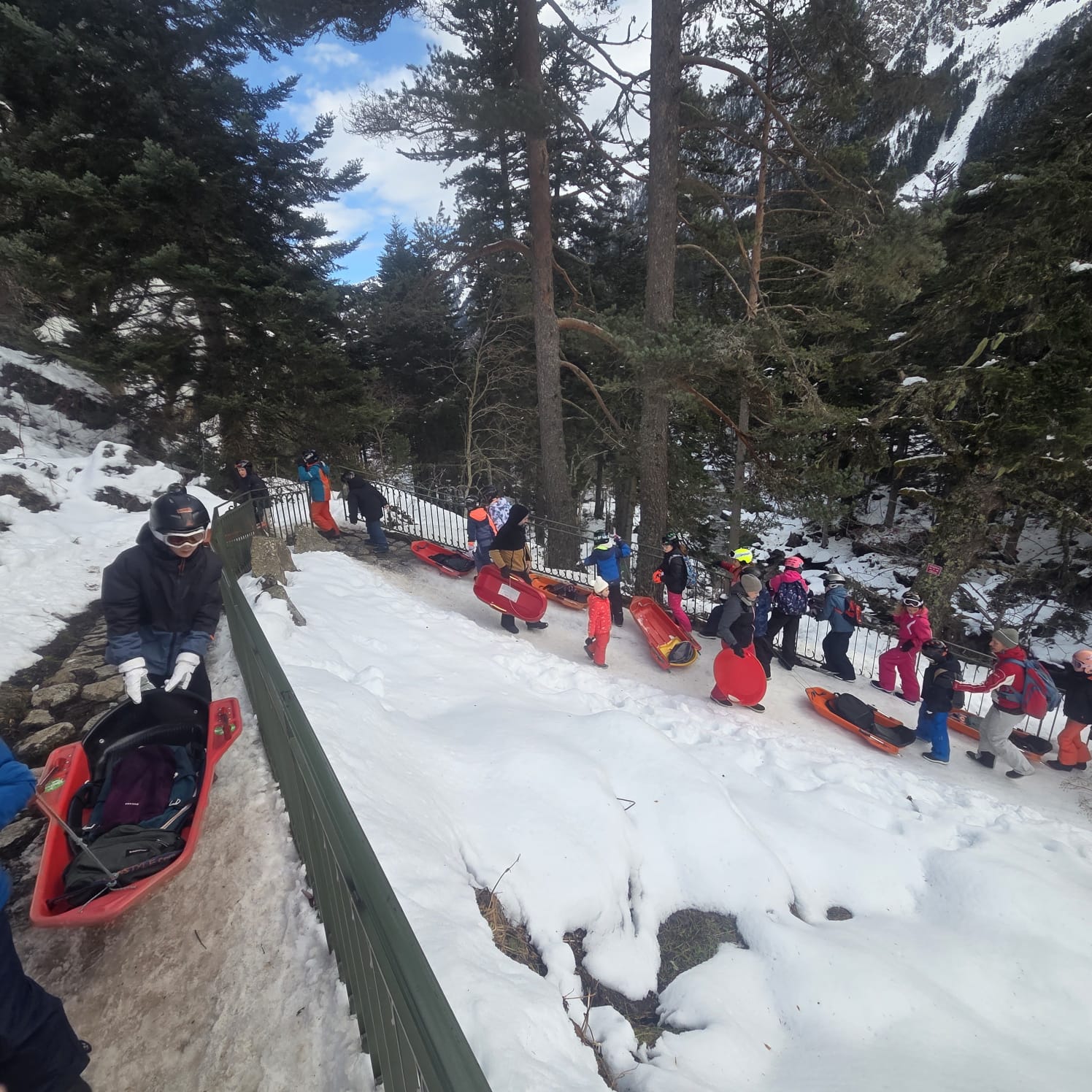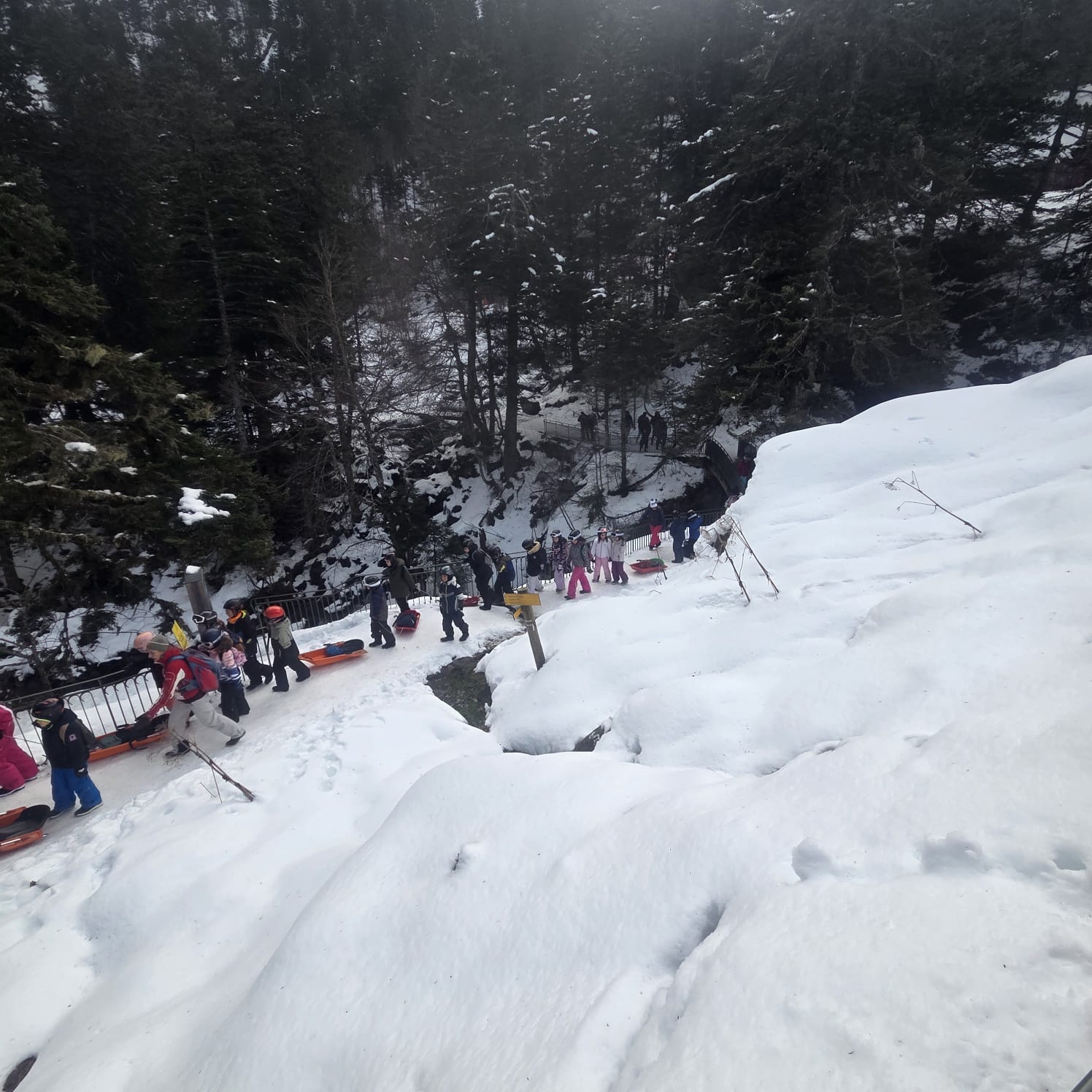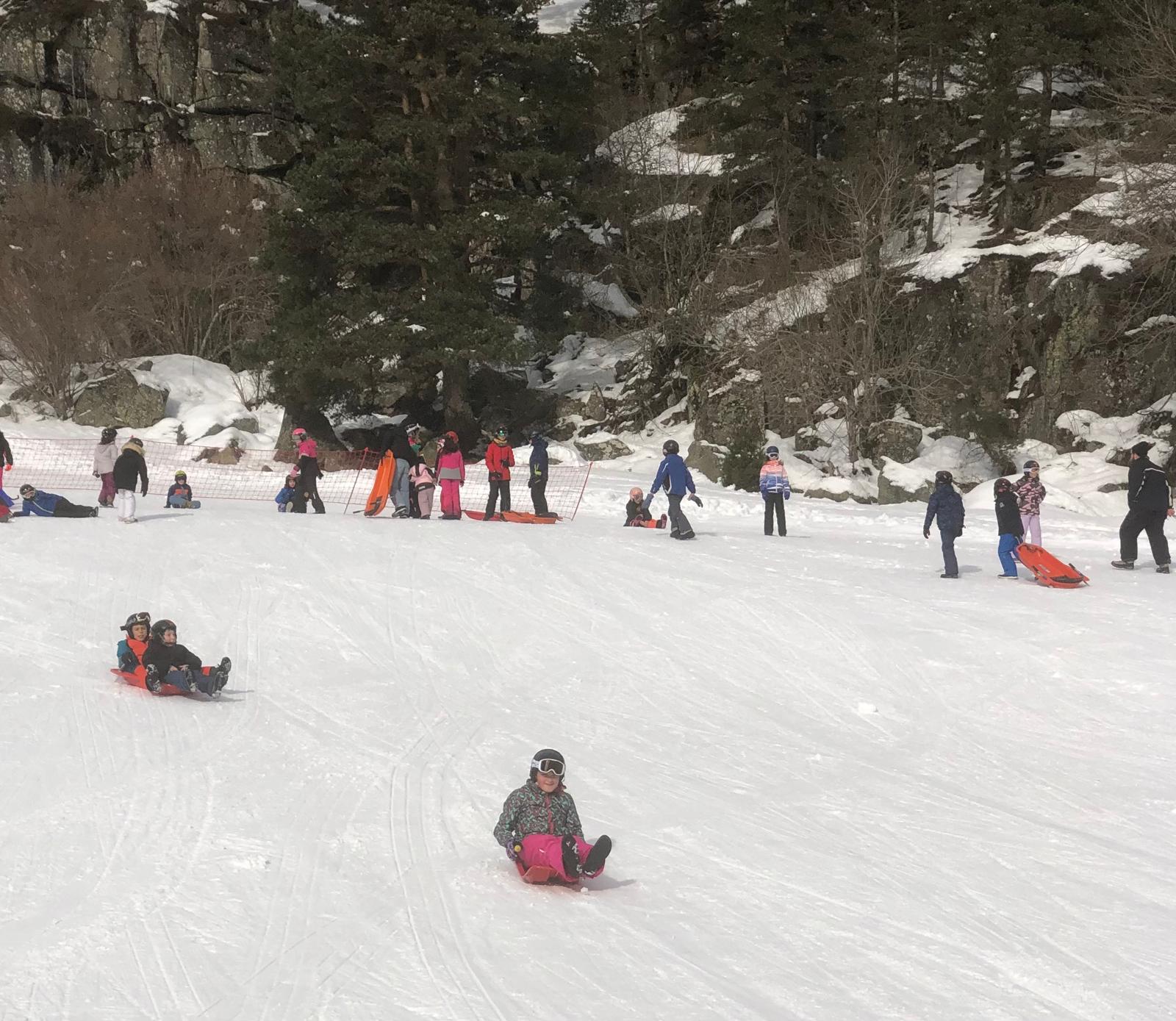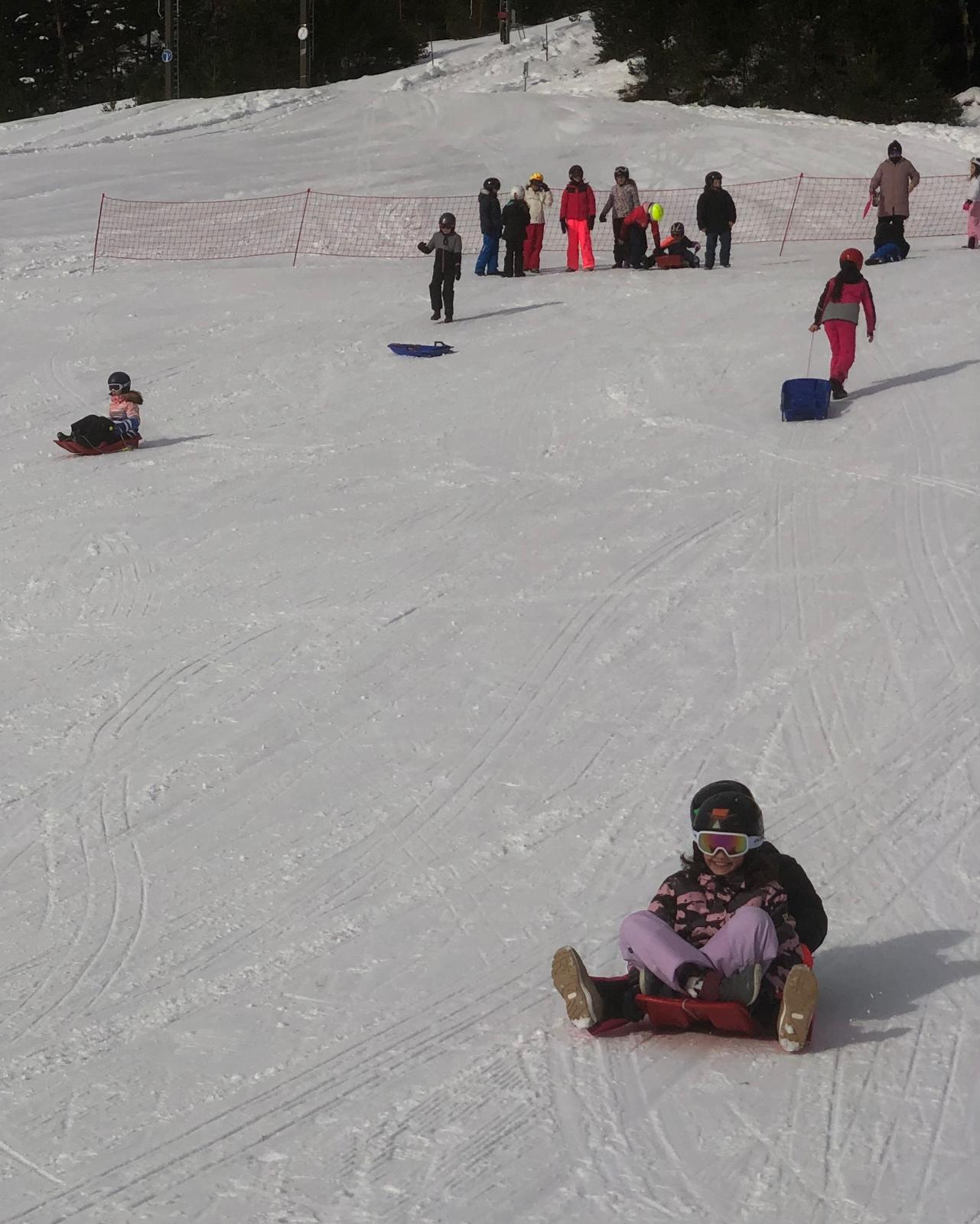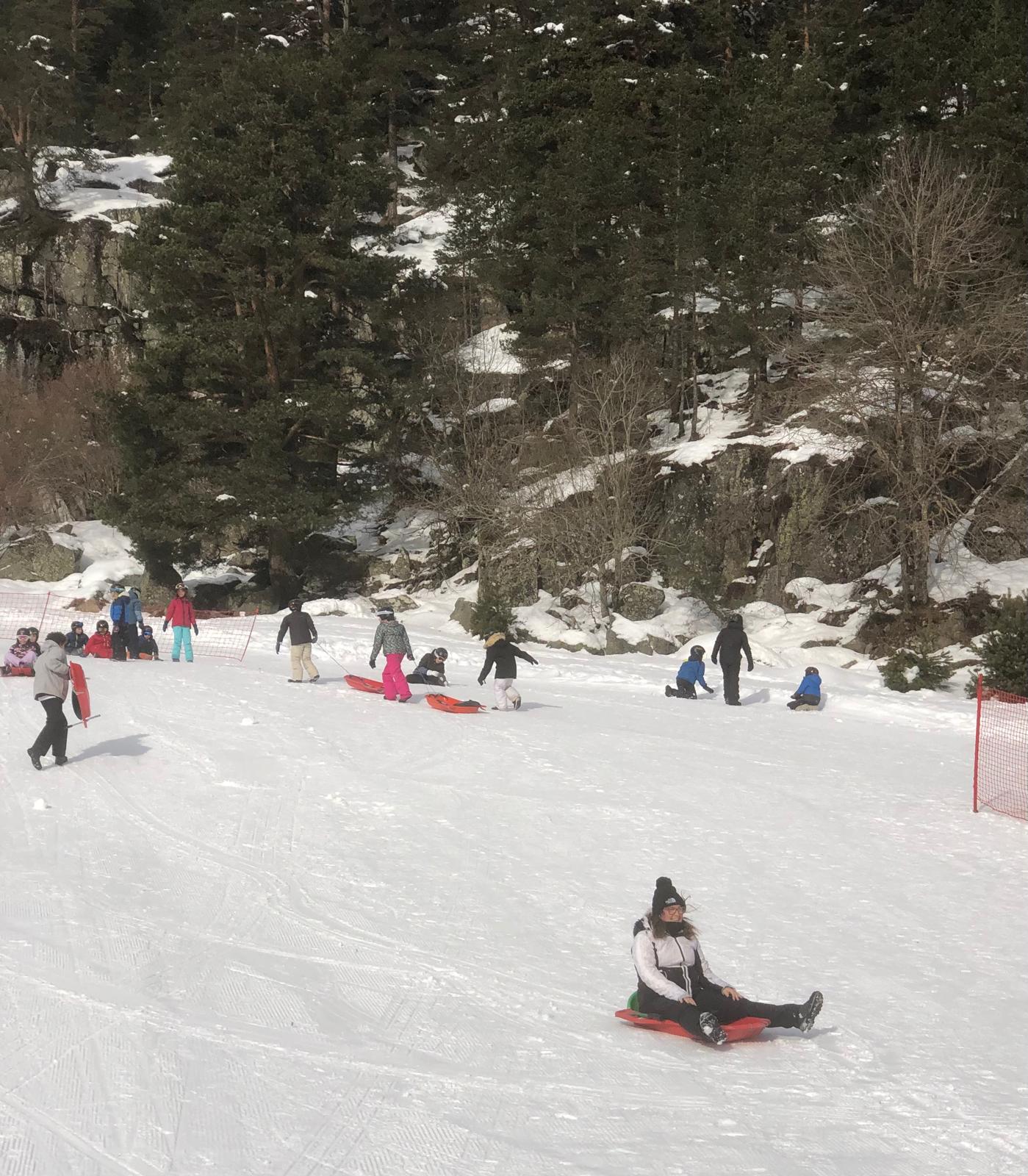 Le car est arrivé et nous avons récupéré des luges au magasin. Quand on est arrivés, il y avait plein de neige !!! Nous avons marché un peu pour arriver sur une immense descente de luge ! Tout le monde s’est précipité sur les luges, parfois, on était même 2 ou 3 par luge ! C’était GENIAL !!!